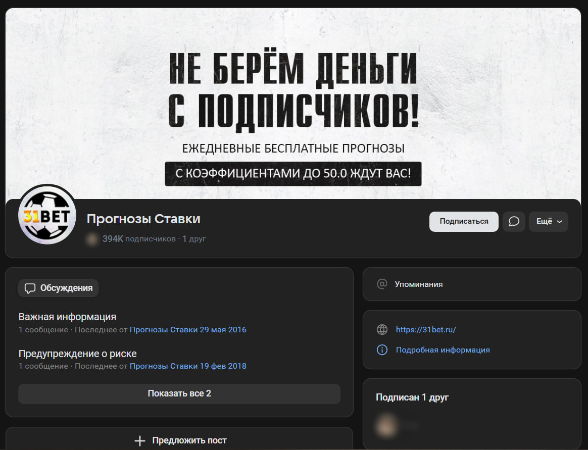 У проекта есть сообщество во «ВКонтакте» с почти 400 000 подписчиков — впечатляющая цифра для этой темы. Комментарии закрыты, каждый пост сообщает о выигрышах, отзывов нет. Публикуются профессионально смонтированные видео с купонами из «Фонбета». Примечательно: сайт и группа активно продвигают свои услуги, но ставки делают в «Фонбете», где проверить подлинность купона нельзя (в отличие, например, от 1xBet). Видео сделаны качественно, и многие могут поверить в их статистику. В Telegram писали, что реальная проходимость 31bet.ru — 40–50%. Бесплатных прогнозов нет, проверить их невозможно.
