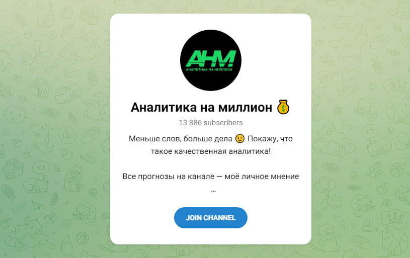 Аналитика на миллион анализирует матчи по хоккею и футболу. Разносторонность может сыграть против: сложно быть экспертом во всем. Основной исход — тотал больше. Для активности публикуются бесплатные прогнозы, а также продаются платные экспрессы. На канале 5.2 тыс. подписчиков, просмотров много, но комментарии отключены. Дополнительный доход Аналитика на миллион получает от рекламы легальной БК, которая платит партнерам за проигрыши привлеченных игроков. При хорошей проходимости его партнерский счет уходит в минус.