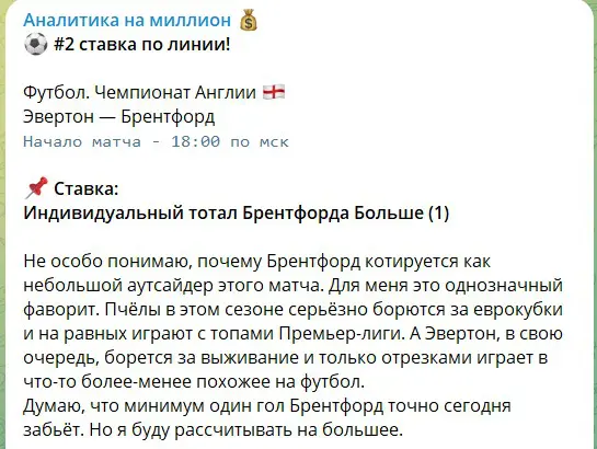Пишу как подписчик с 2021 года. Качество анализа в этом канале просто космос, особенно по тоталам в матчах топ-5 лиг.