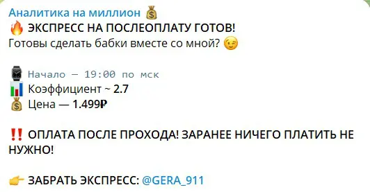 Аналитика на миллион делится прогнозами на футбол и хоккей в формате ординаров и экспрессов-двойников со средними кэфами. Ежедневно предлагается экспресс с кэфом 2.00–2.70 на постоплате: при выигрыше нужно перевести 1499 рублей. Это дорого — при успешных ставках месячная стоимость может достигать 30 000 рублей. К тому же, экспрессы с низкими коэффициентами на дистанции убыточны из-за высокой маржи БК.