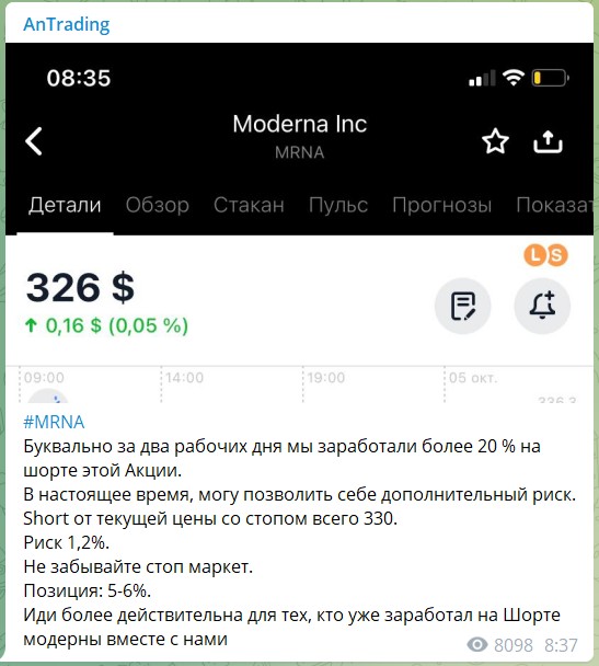 На канале Antrading в Телеграм предоставляются бесплатные сигналы по акциям и криптовалюте, а также подробно указаны точки входа и выхода.