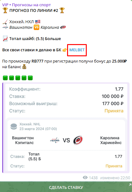 Доход формируется за счет рекламы букмекеров и сторонних Telegram-проектов, включая сомнительные. Реферальные ссылки на БК встречаются регулярно, иногда в виде прямой рекламы. Каппер сотрудничает с конторой, предлагающей высокий процент по RevShare, что мотивирует выдавать низкокачественные прогнозы: чем больше проигрывают игроки, тем выше его заработок.