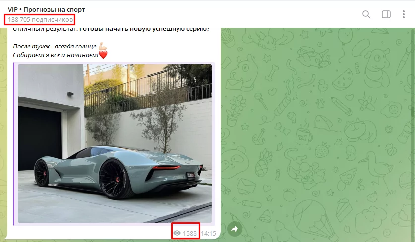 На канал подписано 138 705 человек, но активных пользователей мало: посты набирают не более 2 тыс. просмотров. Уровень активности — около 1.5%, что указывает на большое количество ботов. Капперы с качественными прогнозами и хорошей репутацией не прибегают к искусственному накручиванию аудитории. Данные актуальны на 25.03.2024.