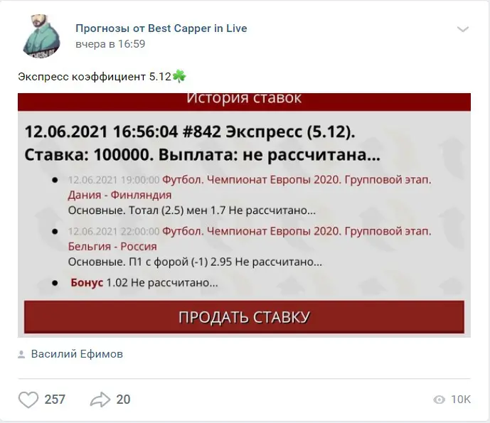 Мы проверили каппера Василия Ефимова и его проект Best Capper in Live в VK и Telegram. Мошенничество не подтверждено, но и доказательств высокой проходимости прогнозов на футбол, волейбол и хоккей нет.