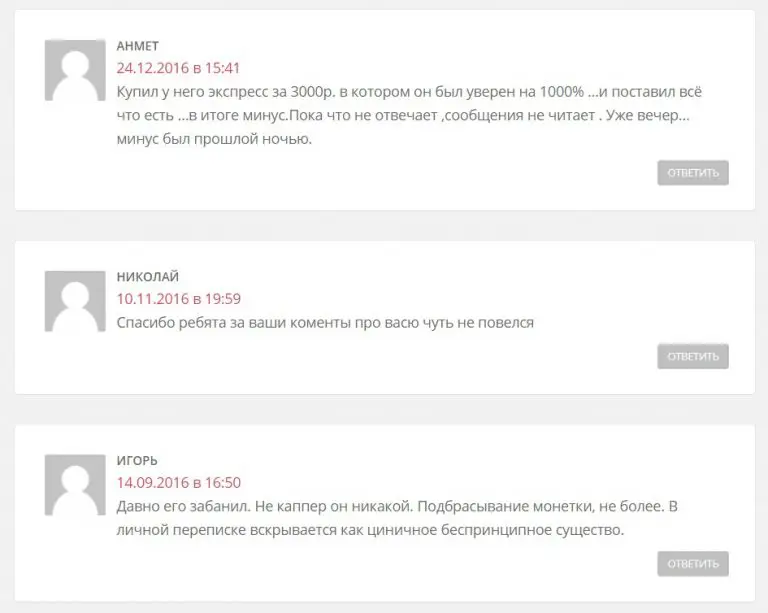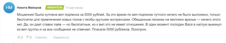 В своих группах и Telegram Ефимов выкладывает переписки и выигрышные купоны от «довольных» подписчиков. Однако на тематических сайтах — сплошной негатив: низкие оценки, жалобы от участников VIP-чата. На «Рейтинге Букмекеров» проект в черном списке.