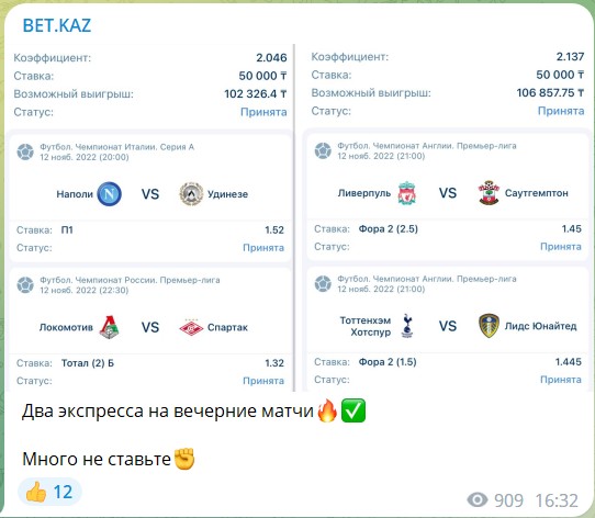 На канале доступны бесплатные ставки и платные экспрессы, основной спорт — футбол. Имена создателей и аналитиков скрыты, администратором выступает tvoikapper (@tvoikapperKZ) — к нему обращаются по вопросам подписки. Бесплатные прогнозы публикуются с кф. около 2.00. Экспрессы состоят из исходов с низкими котировками, что вдвойне рискованно: букмекеры закладывают в такие значения высокую маржу, которая увеличивается с каждым событием в купоне.