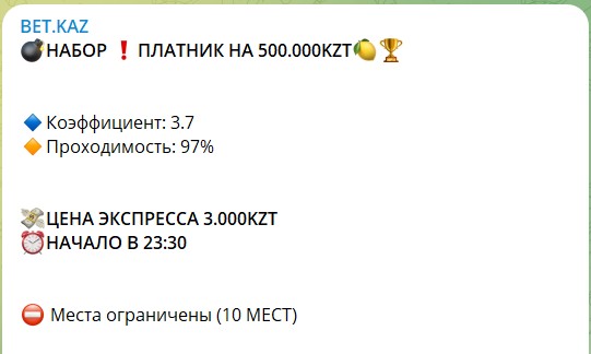 Ежедневно анонсируется продажа экспресса с кф. 3.0+ за 3000 тенге. Цена приемлемая, но канал попал в черный список из-за обещаний 97% проходимости. Это вводит в заблуждение: такие показатели нереальны даже на короткой дистанции в 10–20 ставок.