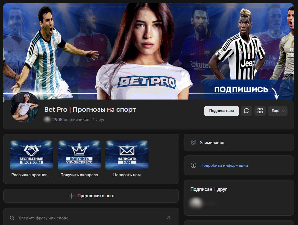 Каппер активен только во «ВКонтакте», где группа насчитывает 290 874 подписчиков. В ленте много постов с предложениями купить подписку или получить экспресс/подписку бесплатно, выполнив условия акций. Бесплатные прогнозы публикуются, но для их использования нужно постоянно следить за группой. Ранее Bet Pro был в Telegram, но ссылки оттуда удалены.
