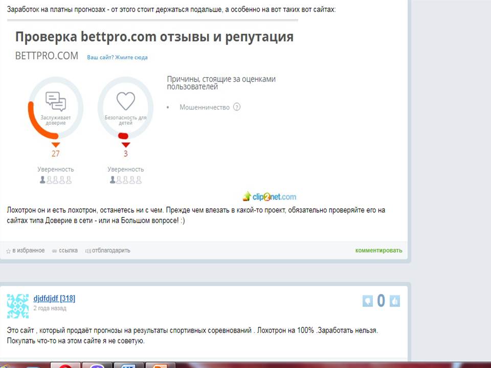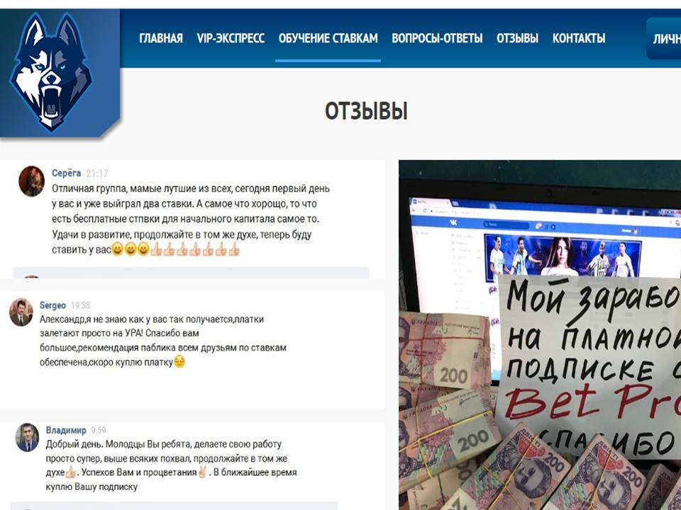 В группе во «ВКонтакте» указано, что от имени Bet Pro действуют мошенники, а настоящие прогнозы продаются только через сайт. Соцсети используются лишь для рекламы и поиска клиентов. Ссылка на сотрудника Bet Pro оказалась недействительной — страница заморожена. Создается впечатление, что сервис зарабатывает, продавая примитивные прогнозы.