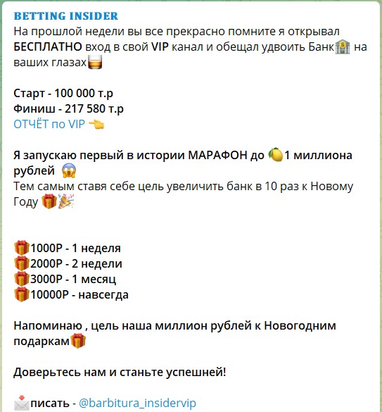 Для повышения доходов всем предлагается вступить в VIP-чат, в котором организован марафон. Стоимость доступа меняется в зависимости от времени подписки.