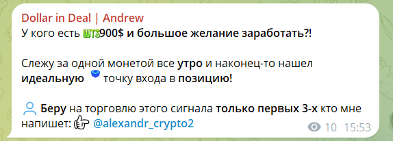 Ключевая сфера работы – это коммерция с криптовалютами на рынке фьючерсов. Трейдер по имени Александр в своем канале Dollar in Deal Andrew предоставляет бесплатные торговые сигналы, представляя их в виде простых постов с указанием точек входа и целевых уровней. Однако причины, по которым выбранные монеты движутся в определенном направлении, остаются неясными.