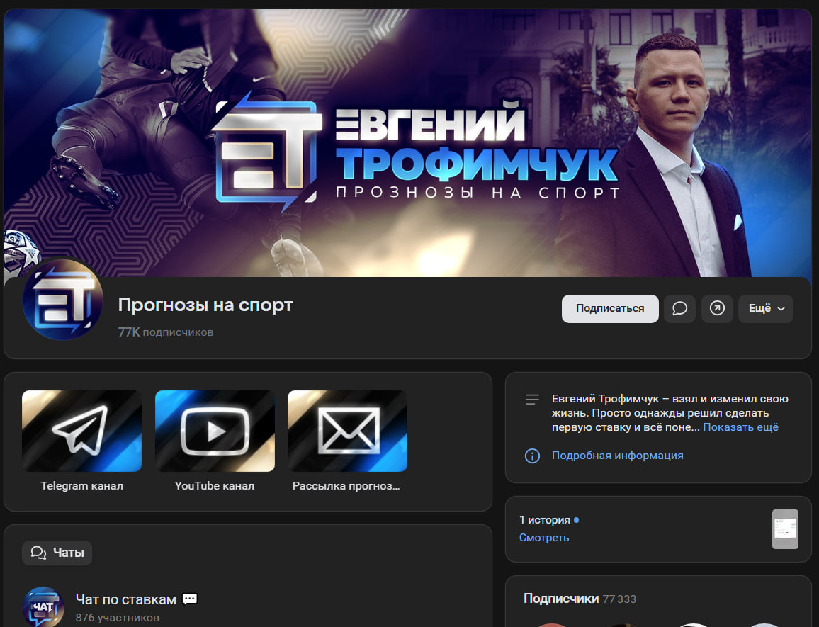 Проекты, связанные со ставками на спорт, в соцсетях обычно недолговечны. Часто капперы обманывают аудиторию, а после волны негатива либо исчезают, либо реинкарнируются под новыми именами. Однако есть и те, кто держится годами. Мы проанализировали крупный проект «Евгений Трофимчук | Прогнозы на спорт», представленный на YouTube, в Telegram и ВКонтакте. Выводы неутешительны: автор обещает нереальную проходимость, а прошлые услуги по раскрутке счетов, судя по отзывам, заканчивались без выплат.