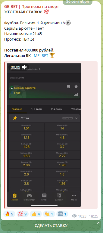 Telegram-канал «GB BET | Прогнозы на спорт», возглавляемый Дмитрием Гордеевым, имеет негативные отзывы в сети. Проект сосредоточен на ставках на футбол, а каппер утверждает, что работает уже несколько лет и все его клиенты довольны результатами. В ленте активно продвигается букмекерская контора MelBet через реферальную ссылку, а новым пользователям обещают бонус до 25 000 рублей при регистрации. В этом обзоре мы разберем, можно ли доверять проекту или же Гордеев использует мошенническую схему.