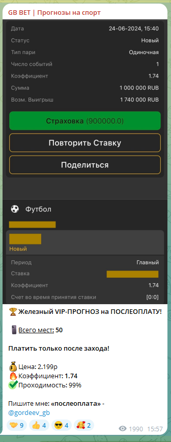 Платные прогнозы на канале доступны по системе послеоплаты за 2 199 рублей. Гордеев заявляет о 100% проходимости, что в беттинге невозможно и является явным обманом.