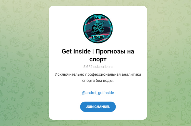 Имена аналитиков канала остаются неизвестными. С подписчиками взаимодействует администратор под ником @getinside_manager. В ленте публикуются бесплатные прогнозы, в основном на хоккей, иногда на теннис. Аудитория — 10,6 тыс. человек, но просмотров мало, что наводит на мысль о накрутке. Комментарии отключены, чата нет. Ежедневно выходят бесплатные ставки с кф. до 1.65 и краткими пояснениями.
