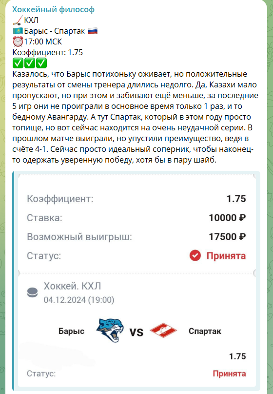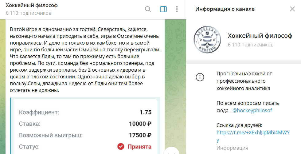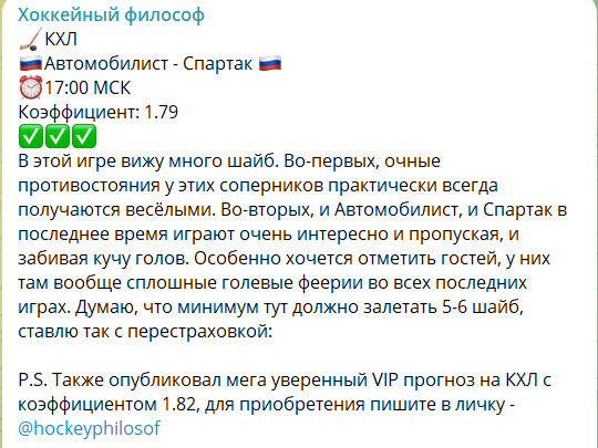 Платный прогноз на канале Telegram под названием «Хоккейный философ»