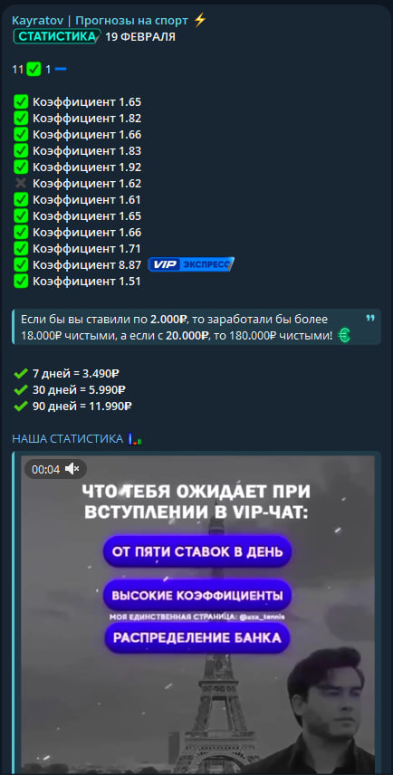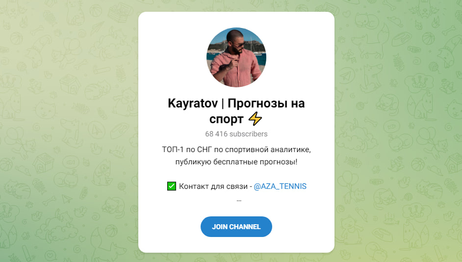 Kayratov — это капперский проект, который ведёт свою деятельность в Telegram и ВКонтакте под руководством некоего Азамата Кайратова. Здесь предлагают как бесплатные, так и платные спортивные прогнозы. Ставки охватывают разные виды спорта, что, скорее всего, снижает их точность на долгой дистанции.
