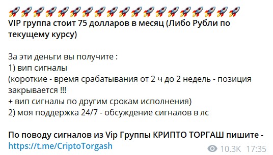На канале уже 68 тысяч подписчиков, и число заинтересованных пользователей продолжает увеличиваться, что подтверждается высокими показателями просмотров. Основателем, менеджером и ведущим трейдером проекта является Николай Крипто Торгаш (@CriptoTorgash). В общей ленте публикуются бесплатные торговые сигналы и актуальные новости с рынка. Рекламные материалы бирж отсутствуют. Даже если бы реклама по регистрации на платформах имелась, это не стало бы отрицательным моментом, так как криптовалютные биржи выплачивают небольшой процент по партнерской программе за каждую завершённую сделку, а не за убытки.