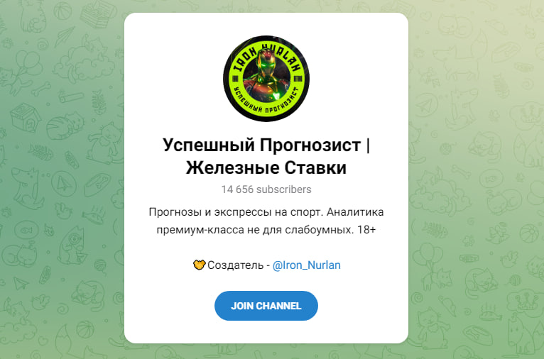 Telegram-канал «Успешный Прогнозист Железные Ставки» создан Игорем Нурланом для продвижения платных экспрессов. На старте он привлекал аудиторию бесплатными прогнозами, но со временем перешел исключительно на платные услуги. На момент обзора у канала более 7000 подписчиков. Основной контент — реклама платных экспрессов, скриншоты купонов и неверифицированные отчеты. Аналитики, обзоров матчей или разбора событий здесь нет. Зато активно продвигается определенная букмекерская контора, что снижает доверие к проекту.