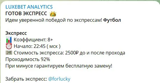 «LUXEBET ANALYTICS» (@forlucky) — сомнительный проект, который лучше обойти стороной. Оставьте свой отзыв о канале сразу после этого обзора!