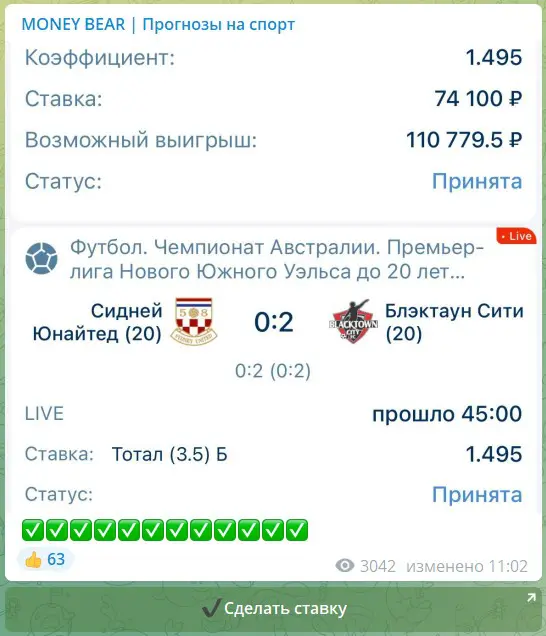 «MONEY BEAR» — спортивный ресурс, созданный Александром Щекалевым. В группе ВКонтакте (108 тыс. подписчиков) активность низкая, комментарии закрыты. Основная площадка — Telegram-канал с 80 тыс. участников. В ленте активно продвигается нелегальная букмекерская контора, что чревато рисками: каппер зарабатывает на проигрышах подписчиков через партнерскую программу. Для игроков из РФ это дополнительная проблема — оффшорные БК могут не выплатить выигрыш или заблокировать вывод средств из-за санкций.