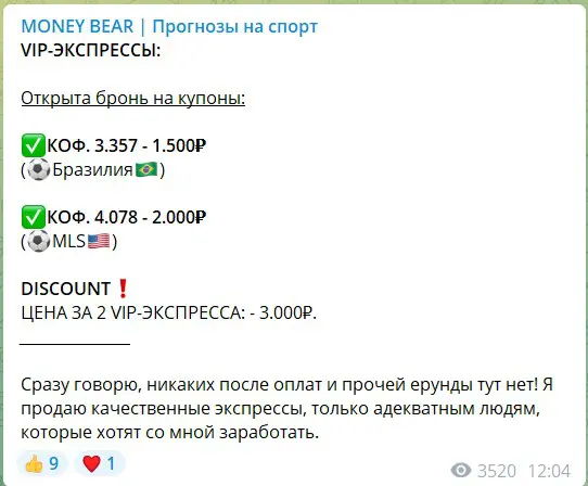 В Telegram мошеннические проекты часто меняют названия и администраторов, чтобы избежать негативной репутации, но есть и такие, что годами обманывают аудиторию под одним брендом. Канал «MONEY BEAR | Прогнозы на спорт» под управлением Александра Щекалева предлагает бесплатные ставки и платные прогнозы. Однако проверка выявила множество жалоб в сети с обвинениями в обмане — от раскрутки счетов до убыточных экспрессов, и таких случаев сотни.