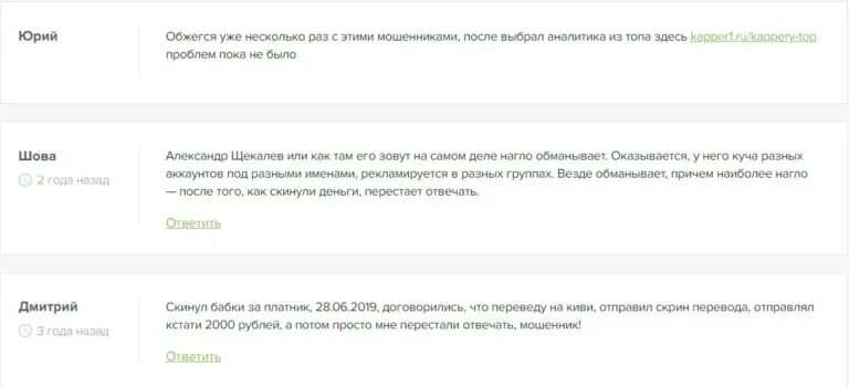 На отдельном канале Щекалев выкладывает статистику и отзывы по платным экспрессам, но отчеты пропадают в дни проигрышей, что указывает на подтасовку. Верифицированных данных нет, а бесплатные ставки показывают низкую проходимость на дистанции. На независимых сайтах — десятки, если не сотни, жалоб на обман, включая слив денег и игнорирование клиентов.