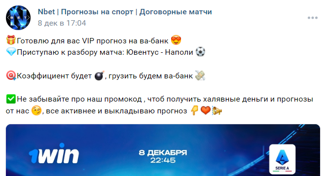 Контент NBet ограничивается прогнозами, отчетами о результатах и предложениями платных услуг. Анализа спортивных событий нет. Встречается реклама букмекерской конторы с промокодами для новичков — типичный признак мошенничества. Такие капперы зарабатывают на проигрышах игроков, привлеченных по реферальным ссылкам.