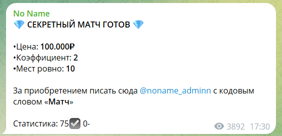 Новички в беттинге часто ориентируются на статистику и отзывы при выборе прогнозиста, но в 99% случаев эти «доказательства» — фальшивка. Telegram-канал No Name под управлением NN Admin (@noname_adminn) — один из таких. Проект попадает в черный список за торговлю вымышленными данными о договорных матчах.