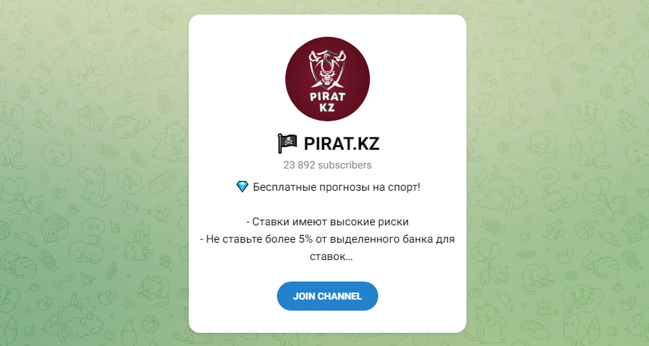 Канал в Telegram PIRAT.KZ сосредоточен на бесплатных и платных прогнозах. В роли прогнозиста и наставника выступает некий Алишка (@RobinHoodKz). Судя по стилю подачи, проект ориентирован на казахстанскую аудиторию. В описании канала новичкам советуют придерживаться флэта до 5% от банка, держать эмоции под контролем и воспринимать ставки как развлечение для большего интереса к матчам.