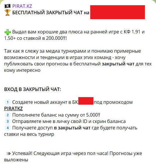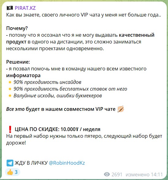 Платные прогнозы на канале PIRAT.KZ представлены экспрессами с высокими коэффициентами (от 5 и выше), что привлекает новичков и людей, далеких от ставок. Стоимость подписки — 1000 рублей (или 5000 тенге), а за доступ в приватную группу просят 2000 рублей (или 10000 тенге).