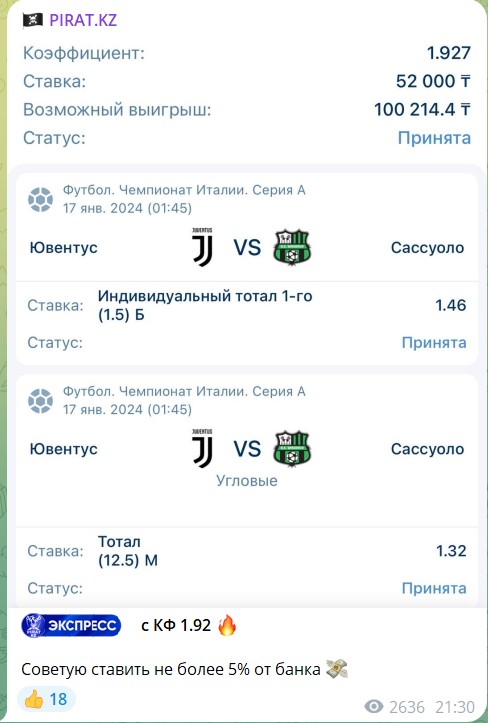 От любых прогнозов (бесплатных или платных) с канала PIRAT.KZ лучше отказаться, чтобы избежать гарантированных потерь. Каппер получает двойную выгоду: от подписчиков за услуги и от букмекера за их проигрыши. Если вы пострадали от действий Алишки (@RobinHoodKz), поделитесь своим отзывом о канале PIRAT.KZ в открытых комментариях!