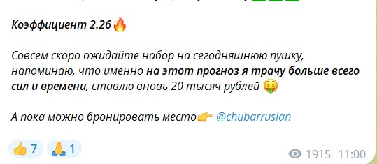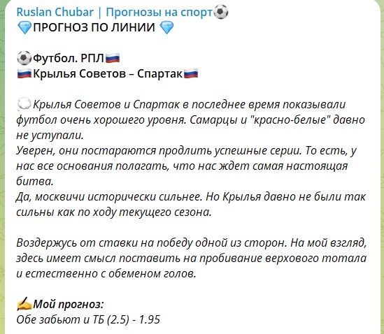 От прогнозов Telegram-канала и YouTube-страницы Ruslan Chubar стоит отказаться сразу. Аналитика, которую выдает Руслан Чубарь, не его — он просто копирует чужие комментарии с других сайтов. Более того, подписчиков направляют к сомнительному букмекеру с многочисленными жалобами на невыплаты. Подробности ниже!