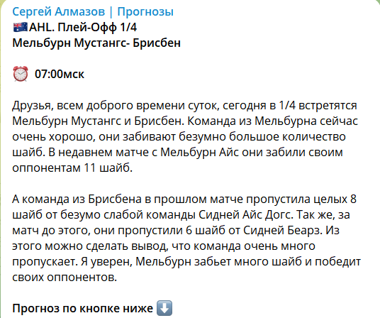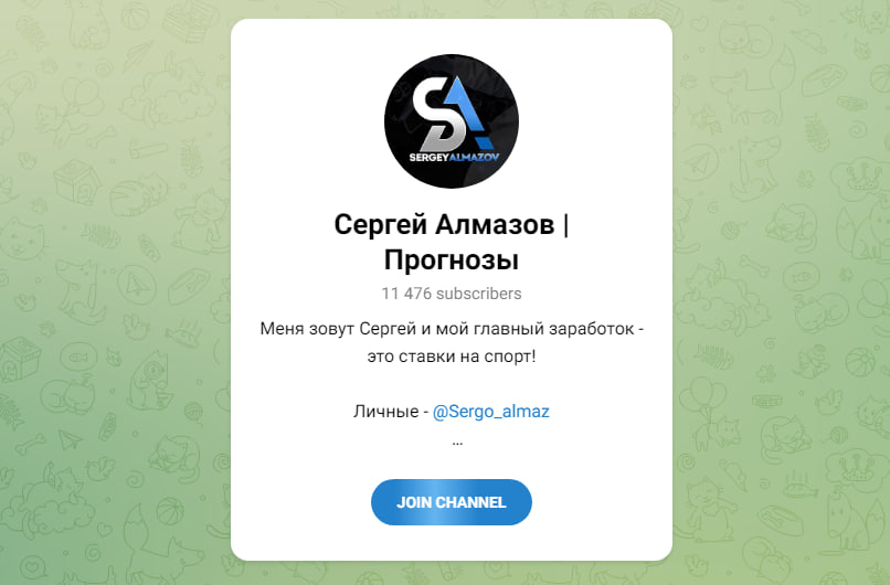 Портал фокусируется на спортивных прогнозах, охватывая почти все дисциплины: футбол, хоккей, теннис. Каппер — Сергей Алмазов (@Sergey_Almaz). Как он успевает качественно анализировать столько видов спорта — загадка. Для привлечения к платным услугам публикуются бесплатные прогнозы с краткими пояснениями и низкими коэффициентами.