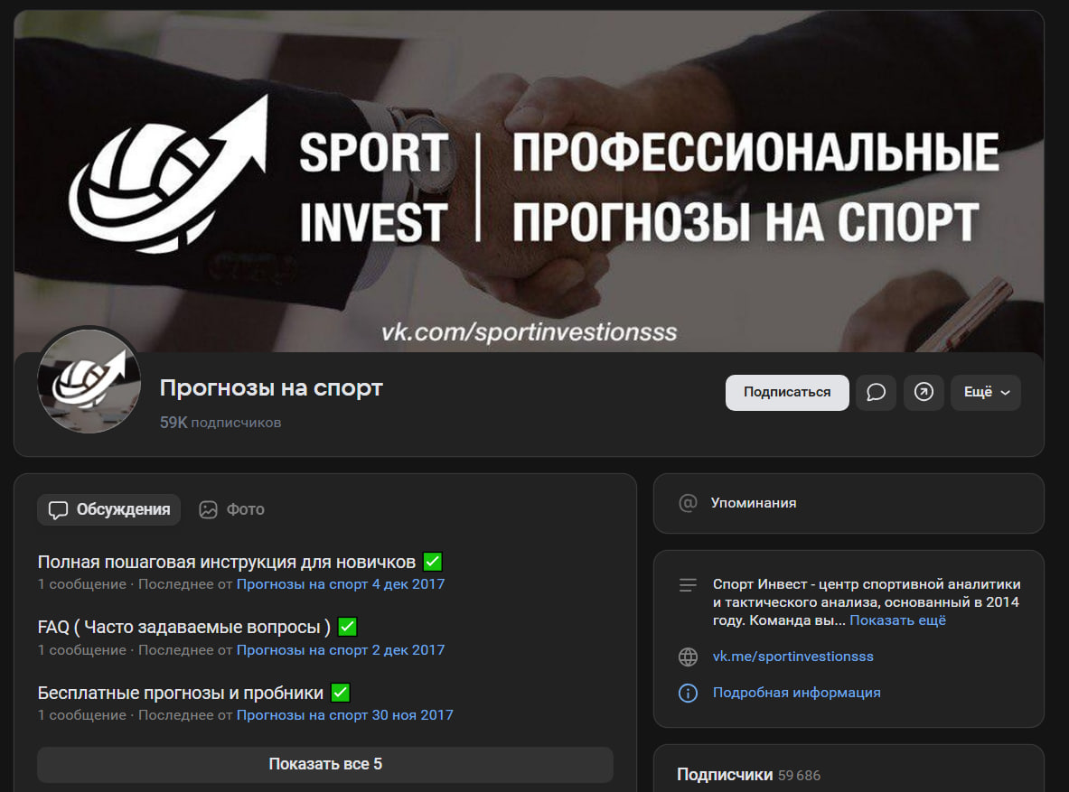 Дмитрий Власов выступает в роли главного прогнозиста. В сообществе активно продвигается легальная букмекерская контора, что само по себе неплохо, но не скрывает факта: администратор зарабатывает на проигрышах своих же подписчиков.