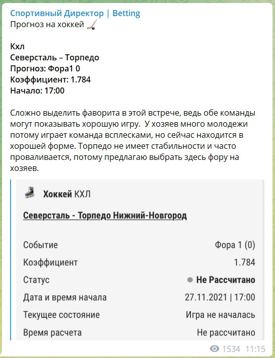 Новый канал появился 12 сентября 2021 года и уже имеет 3 тысячи активных подписчиков. Игорь @sport_director является администратором и каппером, но дополнительная информация о нем отсутствует. Этот аналитик фокусируется исключительно на анализе хоккейных матчей. На данный момент в ленте отсутствует реклама букмекерских организаций (информация актуальна на 04.12.2021).