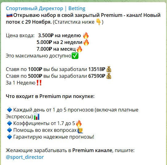 Цена подписки на канал Telegram «Спортивный директор Betting»