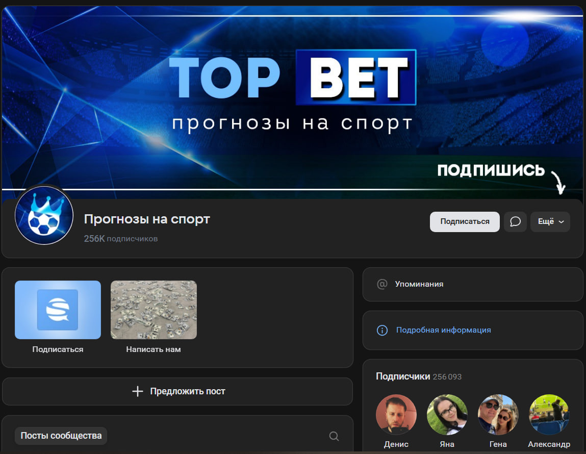 Капперский проект Top Bet стартовал в 2017 году с сайта, а позже появилась группа ВКонтакте. Руководит проектом Сергей Новиков — фигура загадочная, с одной фотографией в соцсети и минимальной активностью.