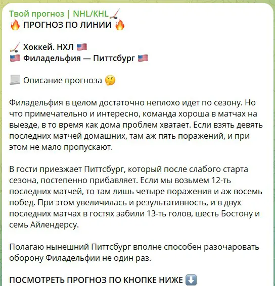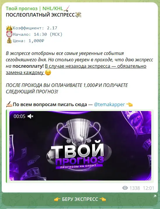 Сервис «Твой прогноз | NHL/KHL» в Telegram предлагает бесплатные и платные прогнозы на хоккей. Каппер Артем (@temakapper) сопровождает свои советы авторскими комментариями, но не ведет никакой статистики. В интернете встречаются редкие негативные отзывы и обзоры с низкими оценками, что указывает на невысокую популярность и слабые результаты на дистанции.