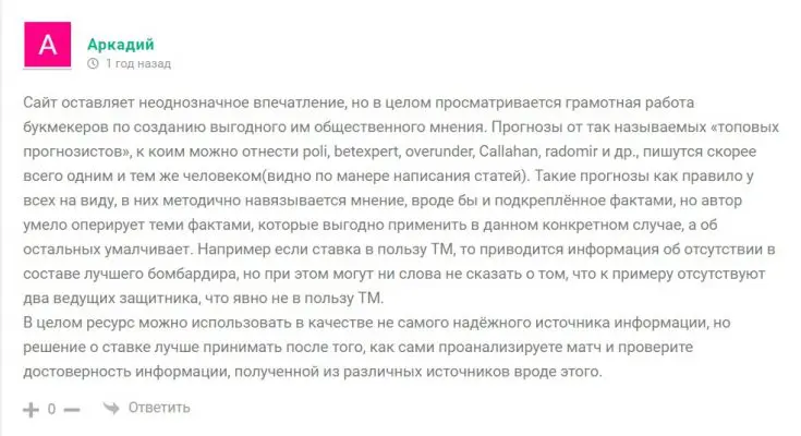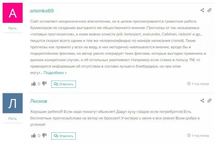 На сайте есть раздел с комментариями, но пишут их в основном участники конкурсов, выигравшие небольшие призы — сомнений в их подлинности нет. На внешних площадках мнения разделились: есть похвалы за качество прогнозов, но встречаются и сдержанно-негативные оценки вроде «всё норм, но не впечатляет». Интересно, что на многих сайтах отзывы выглядят идентично, но под разными именами — возможно, кто-то специально пытается подпортить репутацию. Решайте сами, что думать.